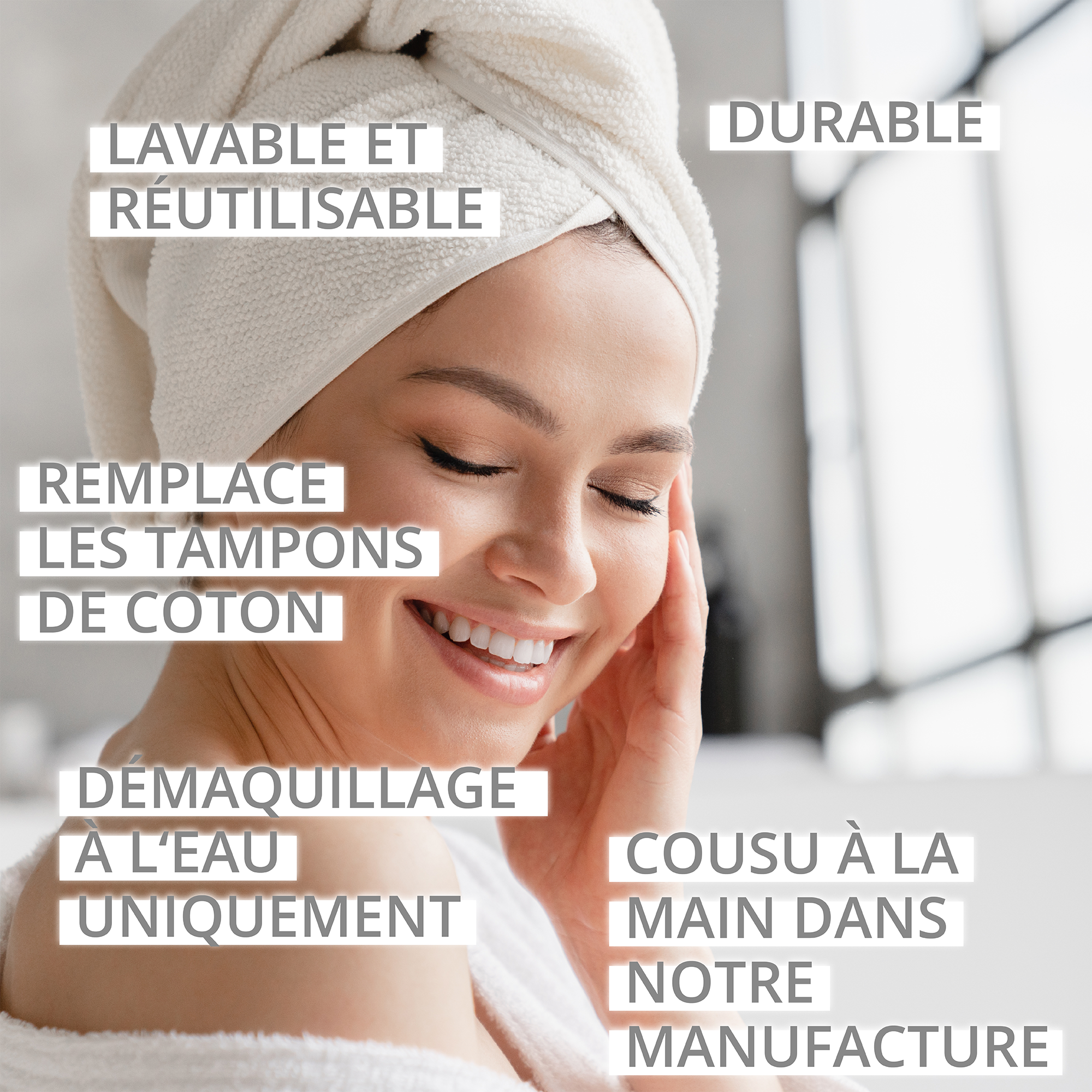 Les lingettes démaquillantes réutilisables éliminent en douceur le maquillage pour les yeux uniquement avec de l’eau. Elles sont très douces et agréables pour la peau, donc idéales pour le contour sensible des yeux.
