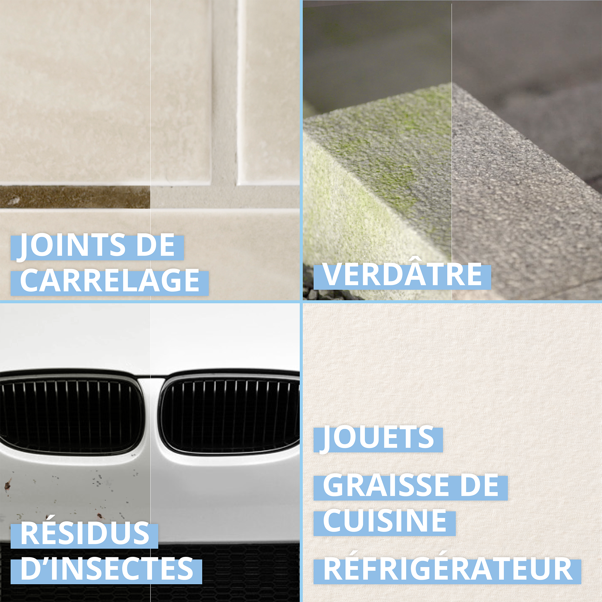 comme les jouets ou les réfrigérateurs. Idéal pour toutes sortes de dépôts organiques tels que les graisses de cuisine, les restes alimentaires, les mousses et algues à l’extérieur, les insectes sur les voitures, les moisissures, et bien d’autres encore. Même les joints de carreaux sales retrouvent une nouvelle vie.
