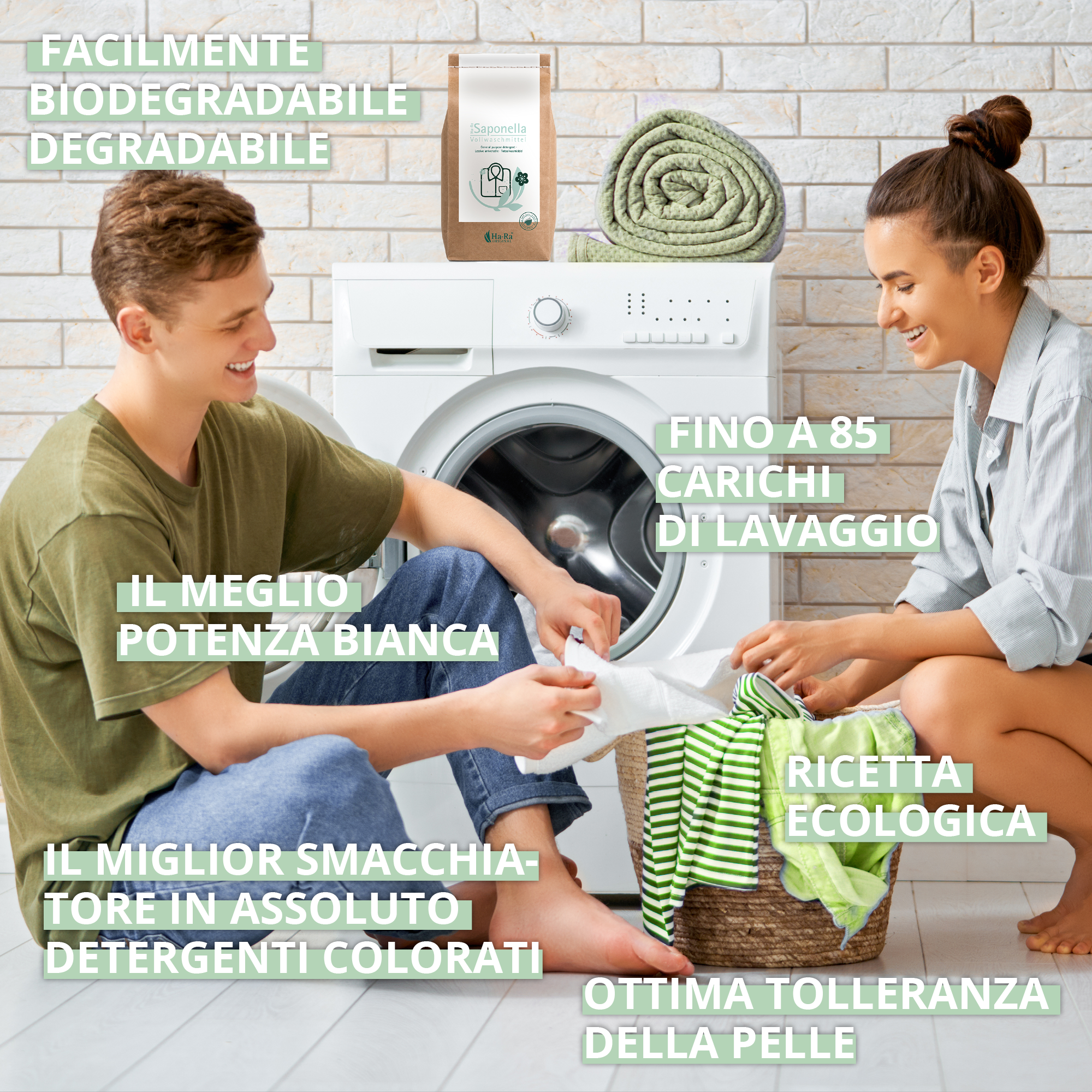 » Formula delicata per l’ambiente e facilmente biodegradabile a base di saponi naturali, con pietra saponaria come sostituto naturale dell’ammorbidente