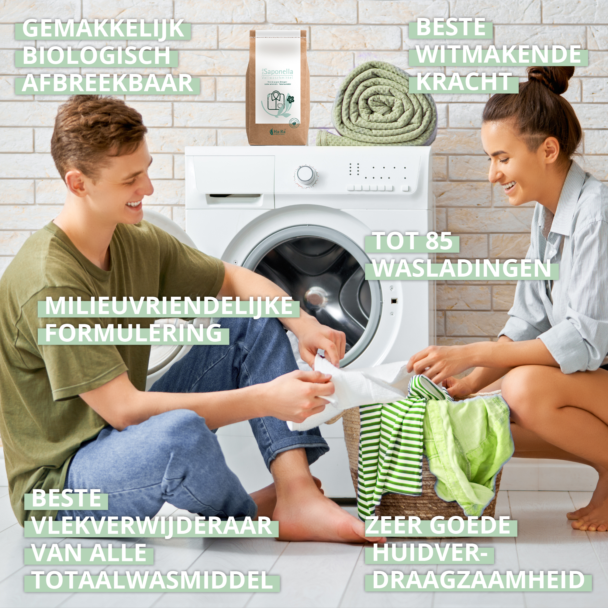 Om witte was te wassen in de wasmachine. Ideaal geschikt voor het reinigen van de Ha-Ra-vezels. Niet geschikt voor wol en zijde. TIP: Voor gekleurd wasgoed adviseren wij Ha-Ra Saponella kleurwasmiddel.